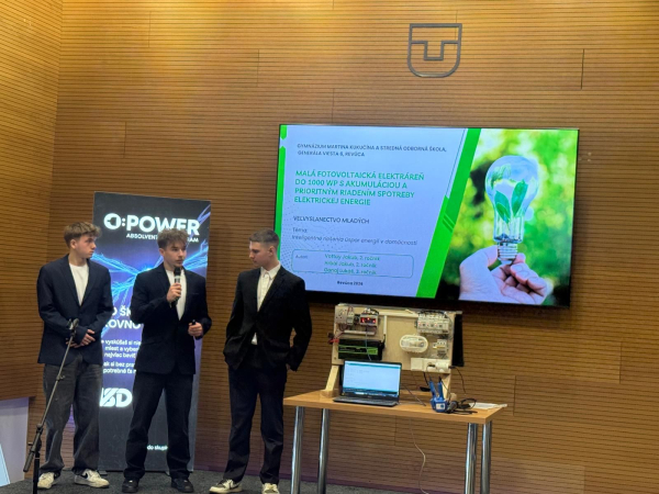 Ich projekt „MALÁ FOTOVOLTAICKÁ ELEKTRÁREŇ DO 1000 Wp S AKUMULÁCIOU A PRIORITNÝM RIADENÍM SPOTREBY ELEKTRICKEJ ENERGIE“ zaujal porotu nielen kvalitou spracovania, ale aj výbornou prezentáciou.